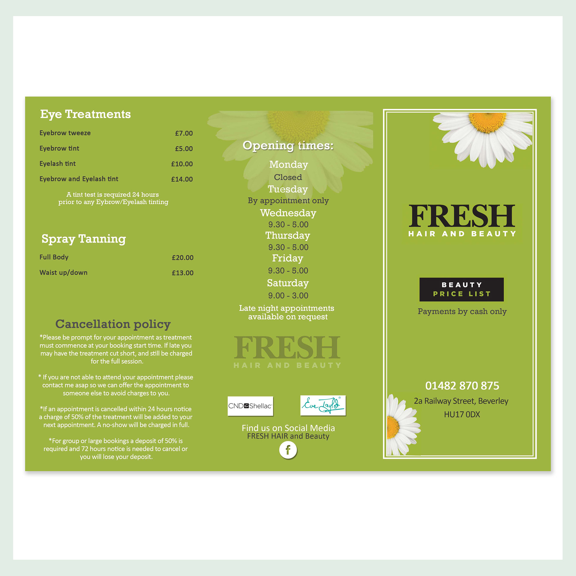 Tri fold price list (outside) for Fresh hair & beauty.
